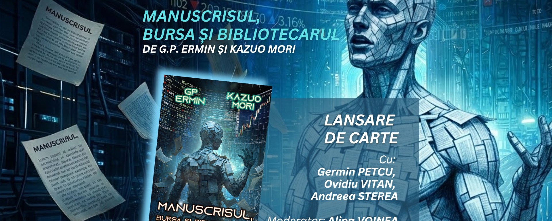 Vineri, 20 martie, 2026, de la ora 18:00, editura Crux Publishing vă invită la lansarea romanului Manuscrisul, Bursa și Bibliotecarul, semnat de G. P. Ermin și Kazuo Mori, o colaborare literară româno-japoneză rară, care aduce împreună pesimismul analitic european și avangarda experimentală niponă.
